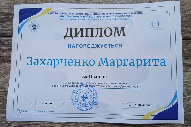 Вітаємо Захарченко Маргариту з перемогою –  II почесне місце у Всеукраїнському турнірі з права серед старшокласників! Турнір проводився у Київському Державному Університеті імені Михайла Драгоманова з метою підвищення правової обізнаності молоді, розвитку критичного мислення та навичок правового аналізу, привернення уваги до питань порушення прав людини в умовах російської широкомасштабної збройної агресії проти України, а також популяризації демократичних цінностей, принципів верховенства права та ідей правової держави.
