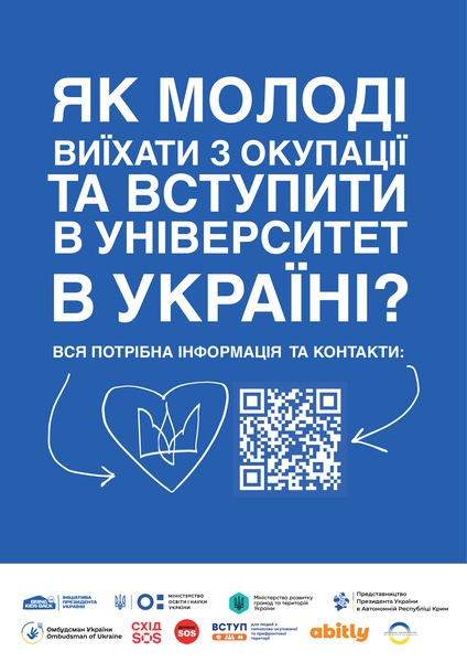 Якщо ви мрієте про майбутнє в Україні та прагнете продовжити навчання в українських закладах освіти, покинувши тимчасово окуповані території, знайте, така можливість є! Відсканувавши один із QR-кодів на інформаційних постерах нижче ви отримаєте детальну інформацію як виїхати та вступити до омріяного навчального закладу.