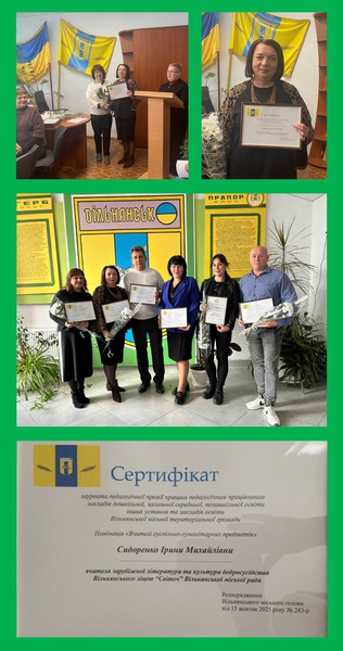 Вітаємо Сидоренко Ірину Михайлівну, яка стала лауреатом педагогічної премії Вільнянської міської територіальної громади у номінації «Вчителі суспільно-гуманітарних предметів».