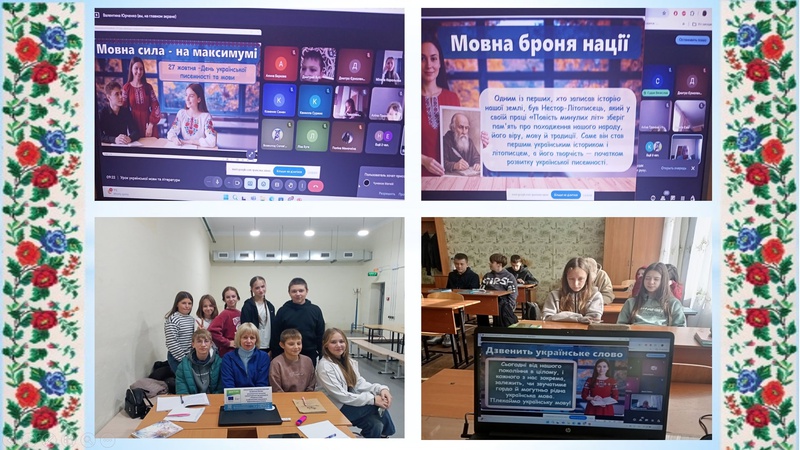 Учитель української мови та літератури Юрченко В.В. разом з учнями 7-х, 8-х класів дізналися про історію виникнення свята, роль Нестора Літописця у розвитку писемності, перші пам’ятки української мови. Світочани брали участь у рольовій грі «Інтерв’ю з Нестором Літописцем», заповнювали текст із пропущеними словами, виконували творчі завдання: створювали власні поетичні рядки у стилі Лесі Українки, вигадували неологізми, презентували улюблені книги. Учні висловлювали свої думки у вправі «Коло думок», розмірковуючи, що для них означає українська мова.