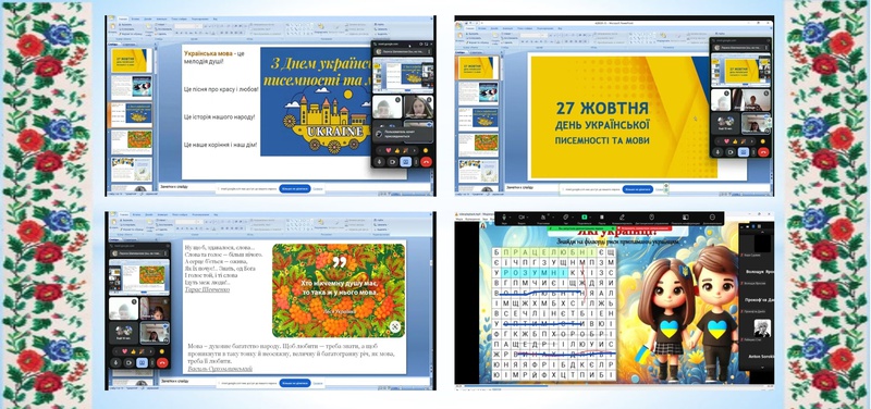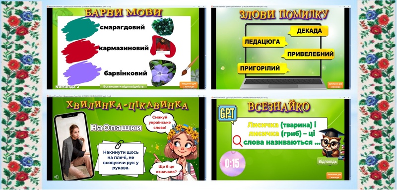 Учитель української мови та літератури Кіріян Т.В. для здобувачів освіти 6-х, 9-х та 11-х класів провела тематичні заходи «Солов’їна чи ви», «Мовний квіз», «Хранителі мови», які покликані втілити високу мету: глибоко усвідомити, що українська мова — наш неоціненний національний скарб, без якого неможливе повноцінне існування народу та держави України, виховувати любов до рідної мови, рідного краю, бажання розмовляти рідною мовою.