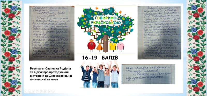 Учитель української мови та літератури Ліщиніна А.О. до Дня української писемності та мови у 5-А класі провела мовознавчу гру «На пошуки мовних перлин». Учні ознайомилися з історією свята та його походженням. Зробили короткі екскурси в минуле, збагатили багаж своїх знань. Окрім того на них чекали веселі і пізнавальні конкурси-раунди, серед найцікавіших: «Мовні загадки», у якому учні змагались у розв'язуванні ребусів; «Хома невіруючий» - цікавий формат питань «вірю/не вірю» дозволив посміятися і дізнатися щось нове; фольклорну розминку забезпечив конкурс «Продовж прислів’я». У 6-Б класі також пройшла інтерактивна гра-подорож «Квітни, наша мово!». Це був цікавий захід, у якому учні змагалися, об’єднавшись у дві команди, вигадавши назву і гасло українознавчого спрямування. Пройшли тематичні станції: «Візитівка», «Скарбниці народної мудрості», Вікторину «Лінгвісти», «Творчу майстерню». За результатами змагань команди отримали однакову кількість балів, новій досвід і багато задоволення від змагання!