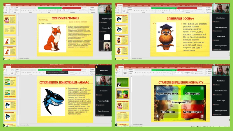 Соціальним педагогом Маргес Н.Г. у рамках акції «16 днів проти насилля» зі здобувачами освіти 7-х класів проведено заняття з елементами тренінгу «Як подолати агресію мирним шляхом». Учні дізналися про стратегії вирішення конфліктів: конфронтація, пристосування, компроміс, співпраця і застосовувати їх у буденному житті.