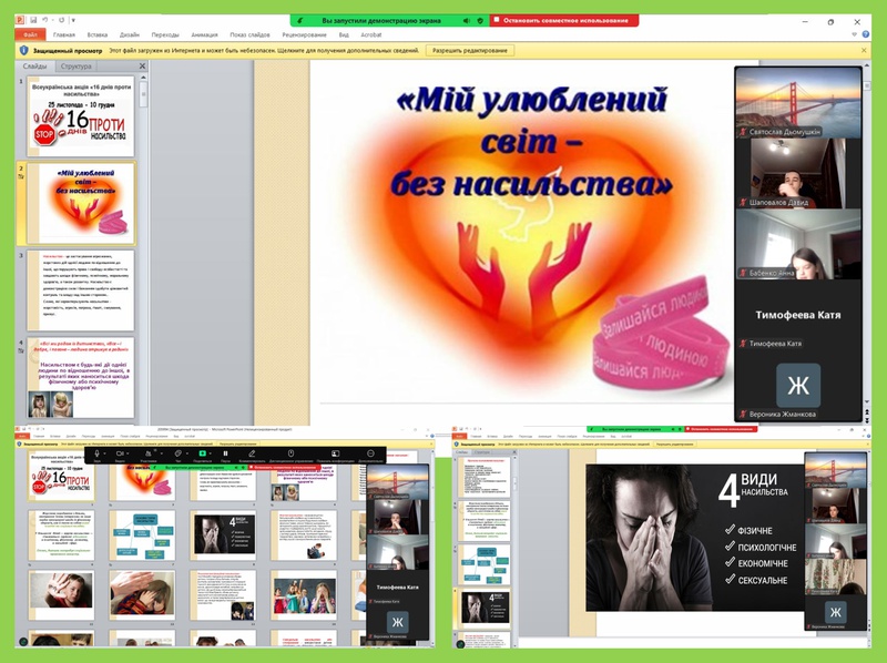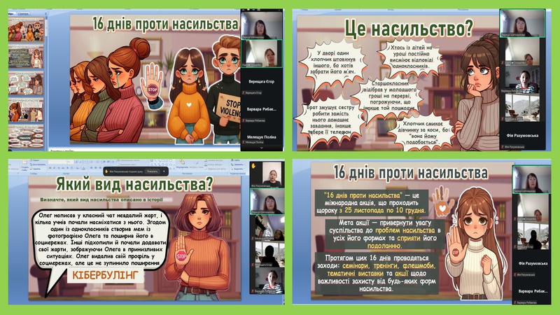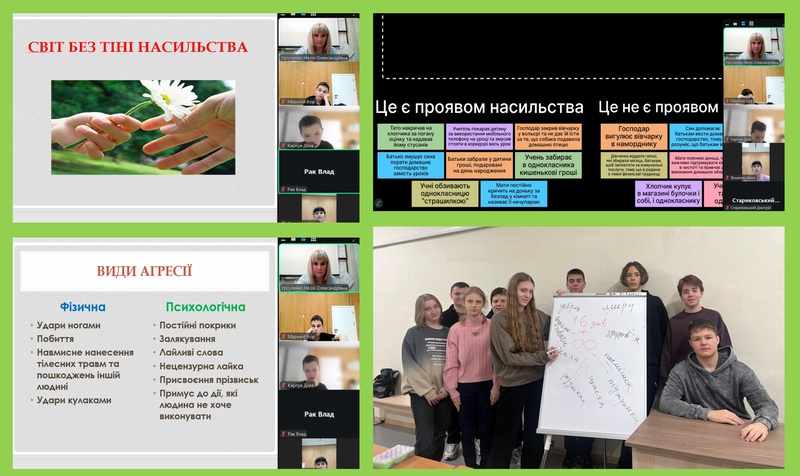 Під час години спілкування «Світ без тіні насильства», учні 8-Б класу (класний керівник Урсуленко Н.О.) ознайомились з поняттями «агресія і насильство», актуальністю проблеми насильства у шкільному середовищі, навчились розрізняти види насильства виконуючи онлайн вправи та обговорювали власну поведінку та алгоритм дій в різних ризикованих ситуаціях.